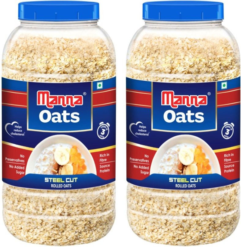 Manna Oats – 2Kg (1Kg X 2 Jars) | Gluten Free Steel Cut Rolled Oats | High In Fibre & Protein | 100% Natural | Helps Maintain Cholesterol. Good For Diabetics Plastic Bottle(2 X 1 Kg) is available on Flipkart at best discounted online price. MRP of this product is ₹ 230.0. You can buy this product at discounted rate ₹ 129.0.