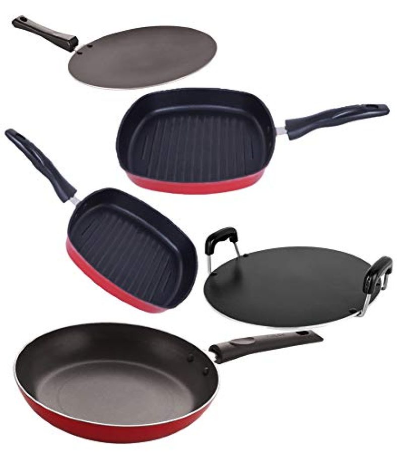- Package Contents :- Concave Tawa 11 – 27.5cm | Grill Pan 22cm – 22.5cm | Grill Pan 24cm – 24.5cm | Round Tawa 12 – 28.5cm – 28.5cm | Tapper Pan 24 – 24cm – 1.6 Ltr