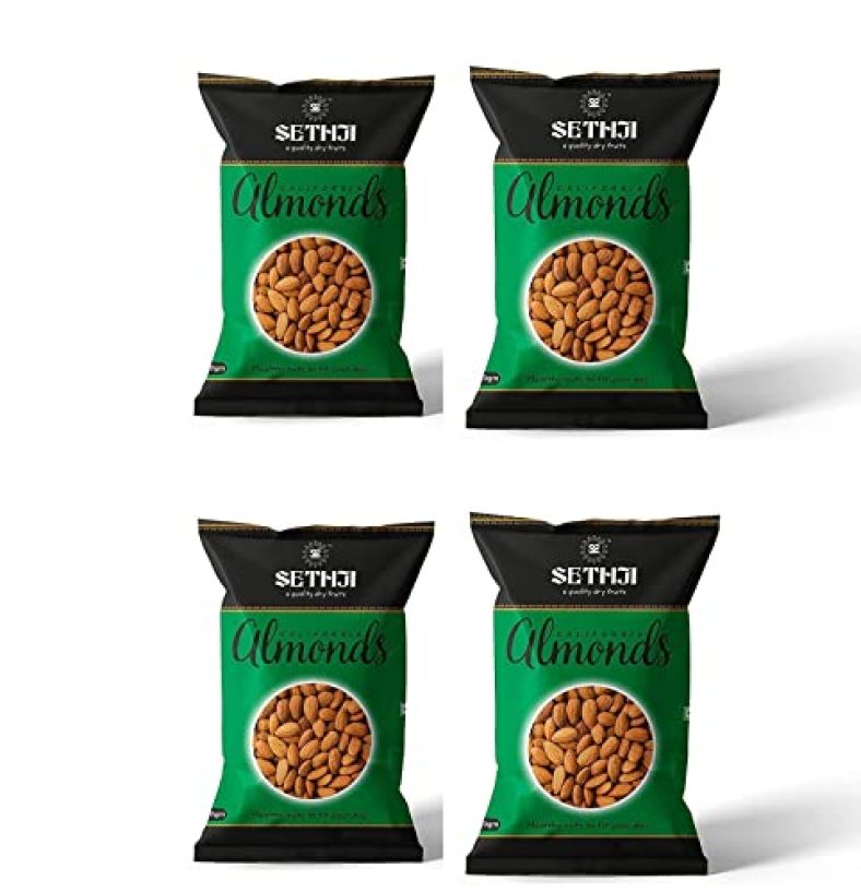 Sethji 250 Gram Each Premium Fresh And Delicious California Almonds / Id Badam Healthy And Delightful Dry Fruits Pouch Value Pack (250Gm Each (Pack Of 4)) is available on Amazon at best discounted online price. MRP of this product is ₹ 1596.0. You can buy this product at discounted rate ₹ 690.0.