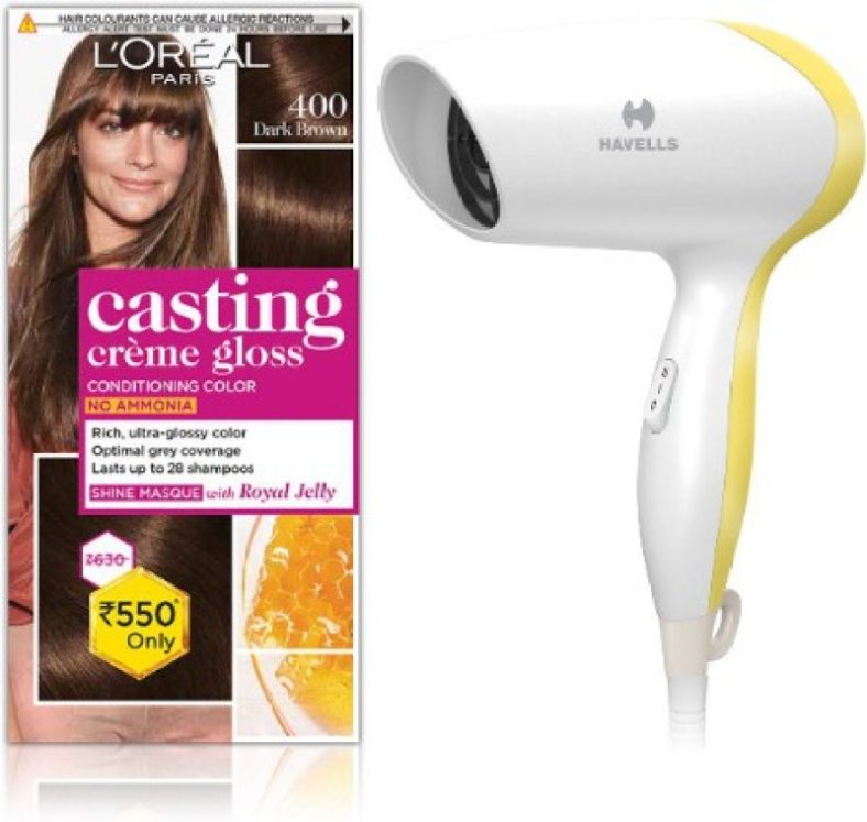 L’Oréal Paris Casting Creme Gloss 400 With Havells Light Weight Hair Dryer 1200 W , Dark Brown is available on Flipkart at best discounted online price. MRP of this product is ₹ 1745.0. You can buy this product at discounted rate ₹ 423.0.
