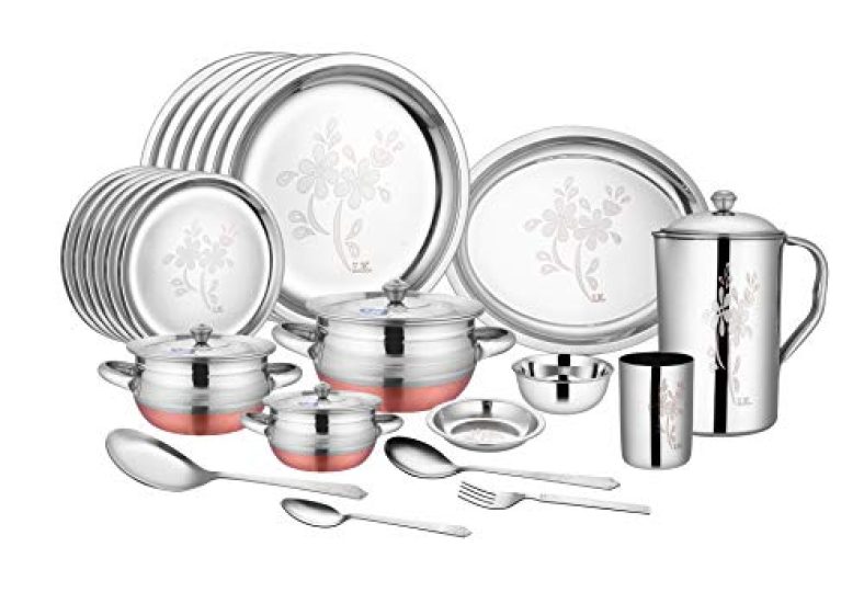 - Color: Silver, Material: Stainless Steel;Package Contents: Crockery wala and company laser finish stainless steel dinner set, 63 pieces, silver.