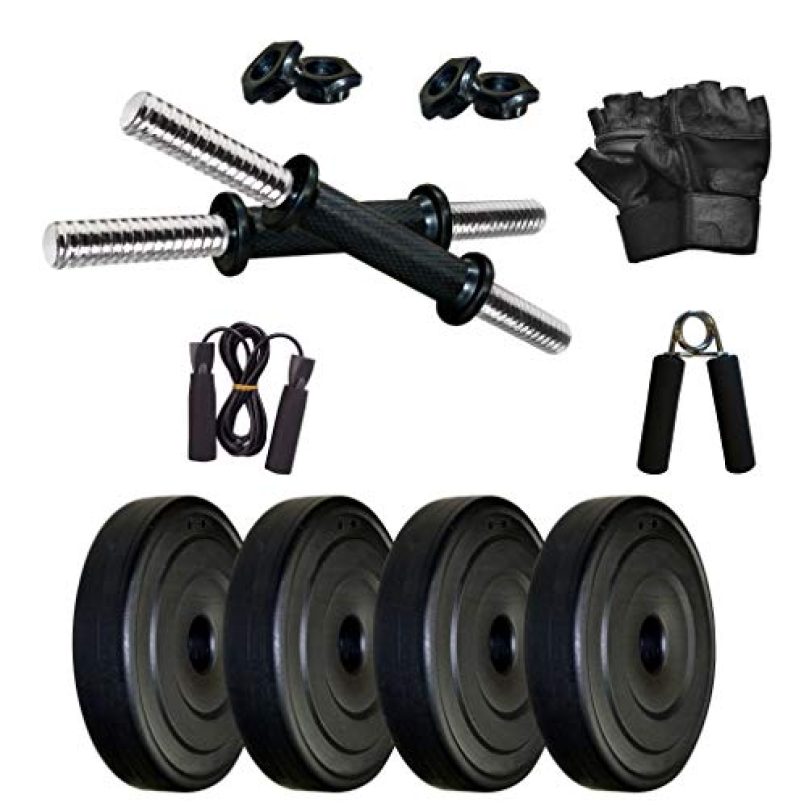 - In-Box Contents: 8 kg of PVC Weight (2 kg x 4 = 8 kg), 2 x 14 inch Dumbbell Rods, 100 Percent Pure Leather Gym Gloves, 1 Skipping Rope, 1 Hand Gripper