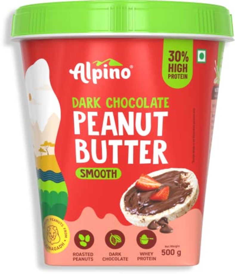 Alpino High Protein Dark Chocolate Peanut Butter Smooth 500 G | 30% High Protein | Made With Roasted Peanuts, Whey Protein, Pea Protein & Dark Chocolate | Peanut Butter Creamy is available on Amazon at best discounted online price. MRP of this product is ₹ 349.0. You can buy this product at discounted rate ₹ 168.0.