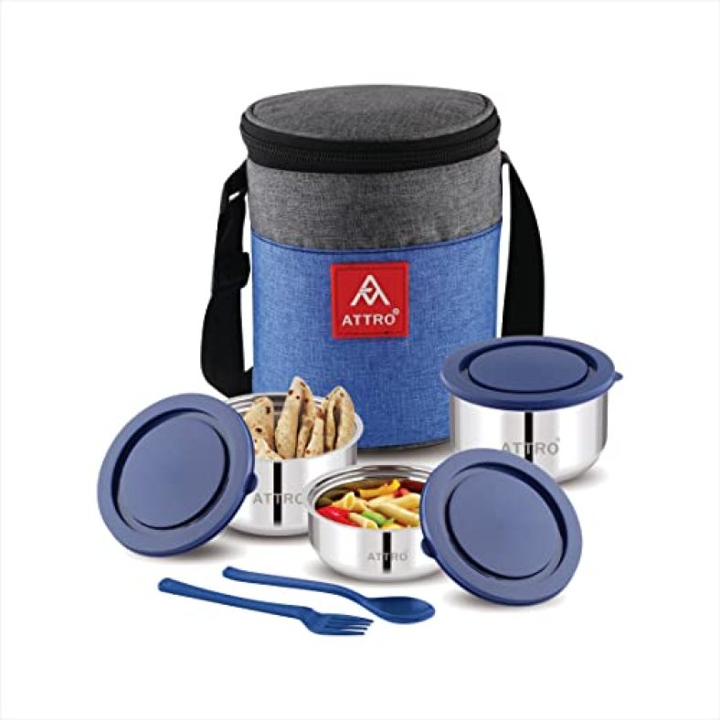 Attro Fresho Stainless Steel Double Wall Lunch Box, Airtight & Leak Proof – 3 Containers With Bag, Fork & Spoon For Office Use, School, Picnic 800 Ml – Dark Blue is available on Amazon at best discounted online price. MRP of this product is ₹ 1299.0. You can buy this product at discounted rate ₹ 599.0.