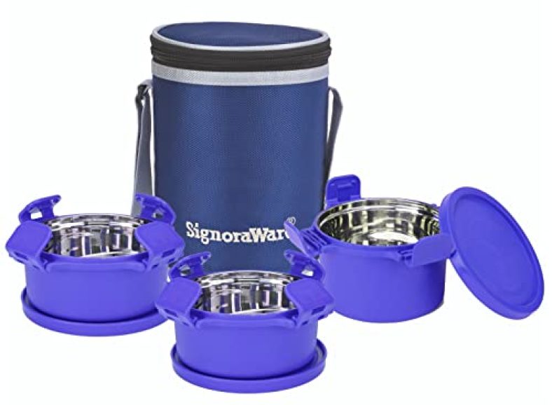 Signoraware 500Ml+350Ml+350Ml Smart Microwave Safe Twin Executive Big Stainless Steel Lunch Box With Bag, Food Grade Bpa Free Conatiners, Air Tight Sleek Leak-Proof Lid Tiffin Boxes (Set 3 Violet) is available on Amazon at best discounted online price. MRP of this product is ₹ 1220.0. You can buy this product at discounted rate ₹ 558.84.