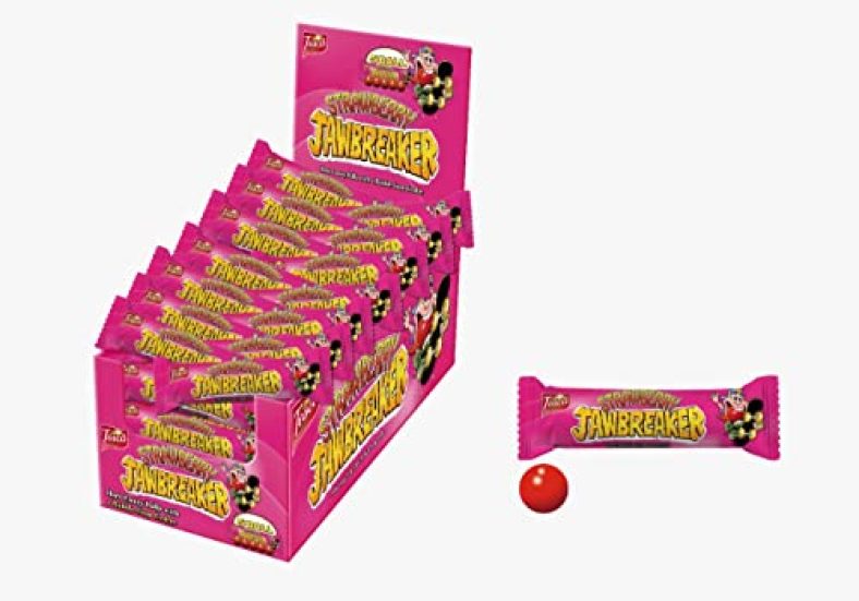 • – Tasty strawberry candy with a bubble gum center.