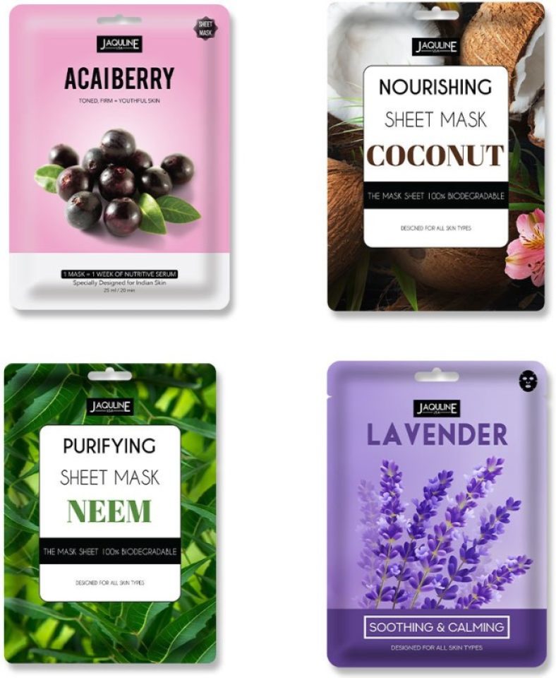 Jaquline Usa Acaiberry , Nourishing Cocounut , Purifing Neem ,Lavender Sheet Mask(100 Ml) is available on Flipkart at best discounted online price. MRP of this product is ₹ 393.0. You can buy this product at discounted rate ₹ 98.