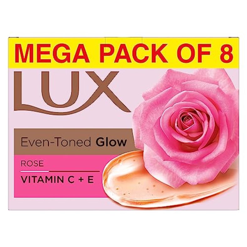 Lux Soft Glow Rose & Vitamin E Beauty Soap Bar, 150 G (Combo Pack Of 8) | Moisturizing Bathing Soap For Soft, Glowing Skin & Body | For Men & Women is available on Amazon at best discounted online price. MRP of this product is ₹ 424.0. You can buy this product at discounted rate ₹ 386.