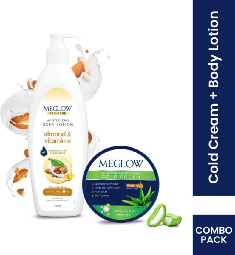 Meglow Almond & Vitamin-E Body Lotion 500Ml + Aloevera Moisturizing Cold Cream 125G(625 Ml) is available on Flipkart at best discounted online price. MRP of this product is ₹ 500.0. You can buy this product at discounted rate ₹ 249.