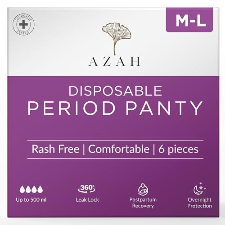 Azah Period Panties For Women Leak Proof (Pack Of 6) 650Ml Absorbent Disposable Panties After Delivery And Night Period Panties With 360° Leak-Proof Technology | M-L is available on Amazon at best discounted online price. MRP of this product is ₹ 349.0. You can buy this product at discounted rate ₹ 189.