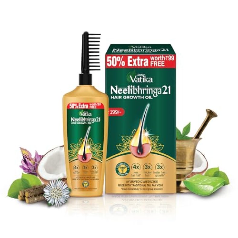 Dabur Vatika Neelibhringa 21 Hair Growth Oil – (50Ml+25Ml Extra Free) | 14 Ayurvedic Herbs | Ayurvedic Medicine | 4X Less Hairfall | 3X Thicker Hair | 21 Hair Benefits | With Ergnomic Comb Applicator is available on Amazon at best discounted online price. Original of this product is ₹ 199.0. You can buy this product at discounted rate ₹ 99.