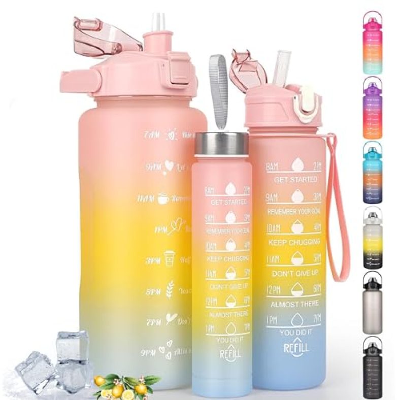 - 2.Water Bottles Set: Includes three bottles of different capacities—2000ml, 700ml, and 300ml—featuring motivational quotes and easy-to-read capacity markers on the back.