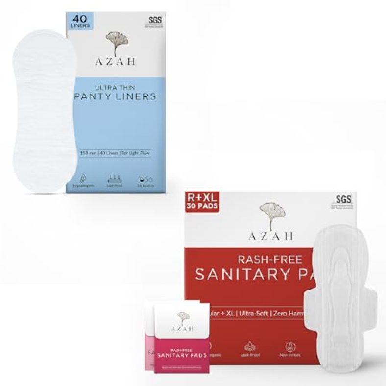 Azah Rash Free Sanitary Pads + Ultra Soft Panty Liners | Sanitary Combo Pack For Women | Pack Of 20 Regular + 10 Xl (With Disposable Bags) Organic Cotton Pads And 40 Liners | Made Safe Certified is available on Amazon at best discounted online price. Original of this product is ₹ 649.0. You can buy this product at discounted rate ₹ 539.
