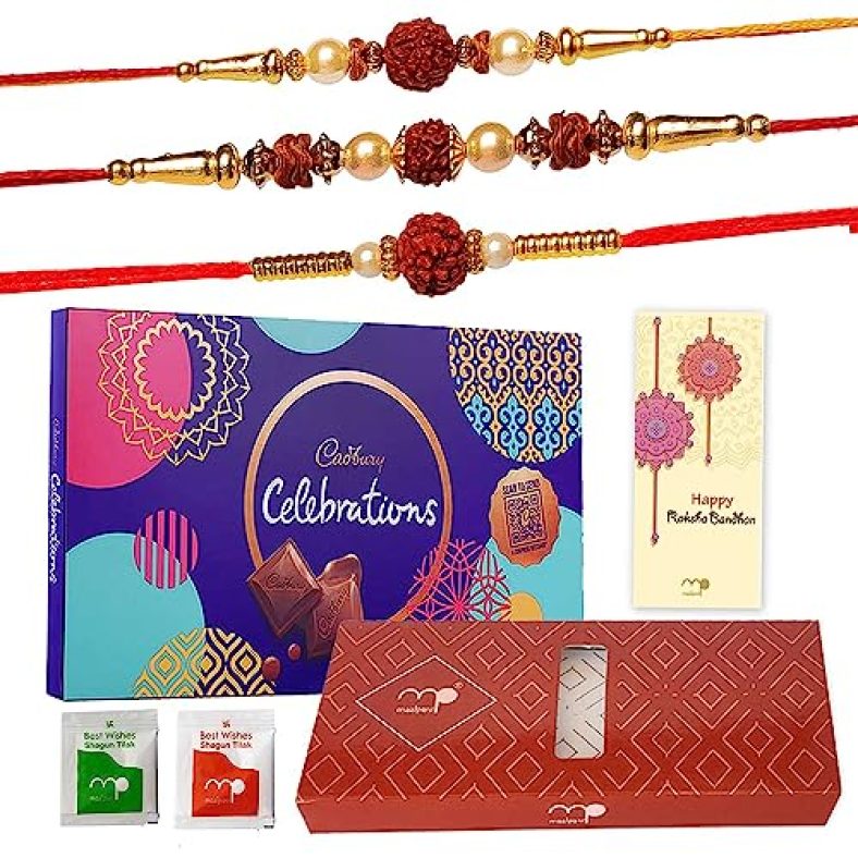 - Rakhi Chocolate Combo – Celebration – Set of 3 Rudraksh Rakhi for Brother Small Multicolor