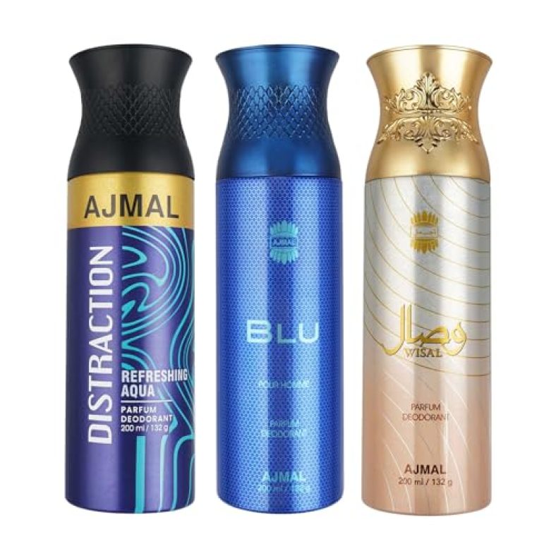 - Package Content – 1 Ajmal Distraction Deodorant of 200ML for Men & Women, 1 Ajmal Blu Homme Deodorant of 200ML for Menand 1 Ajmal Wisal Deodorant of 200ML for Women