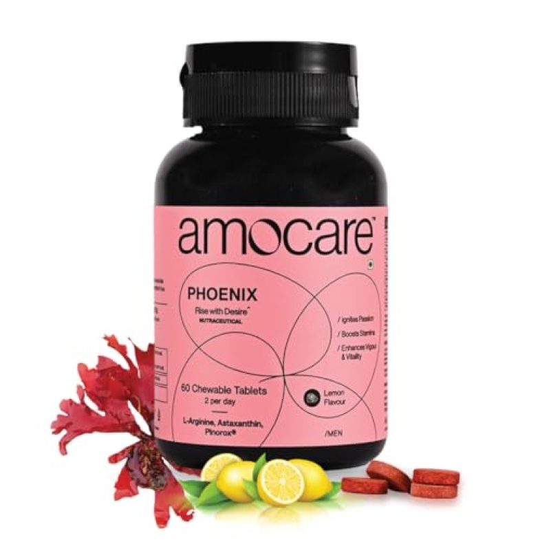 Amocare Phoenix Chewable Tablets For Men | Boosts Stamina And Vitality | Lemon Flavour | Branded Pine Bark Extract | L-Arginine, Astaxanthin, Pinorox | 100% Veg | 60 Tablets