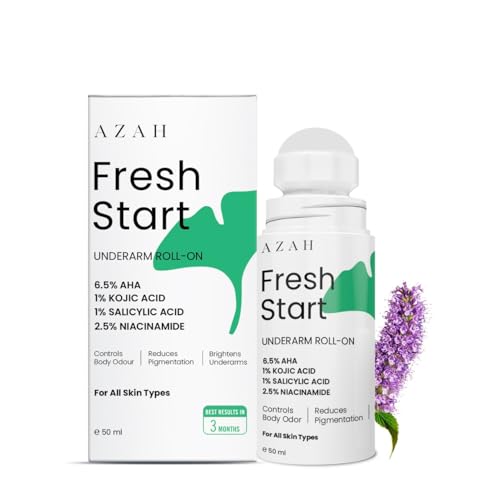 Azah Fresh Start Underarm Roll-On Deodorant For Women| 6.5% Aha, 1% Kojic & 1% Salicylic Acid, 2.5% Niacinamide| Controls Odor & Reduces Pigmentation| 0% Alcohol & 0% Aluminium| 50 Ml is available on Amazon at best discounted online price. Original of this product is ₹ 349.0. You can buy this product at discounted rate ₹ 299.