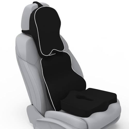 - ✅ Memory Foam Car Seat Cushion Combo – Includes orthopedic lumbar support pillow, coccyx seat cushion, and neck rest pillow for car, office chair, home, and travel. Provides full back support, tailbone relief, and neck comfort during long sitting hours.