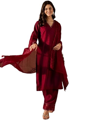 - BEST OF COMFORT AND STYLE: Made from Solid Silk Blend material, Embroidery With Soft Organza Dupatta, and New Style V-Neck A Side-Slit 3 Piece Pant And Straight Solid Kurti With Stylish Maroon Dupatta Set. This Pant and Straight Embroidered Kurti for women is designed to be comfortable all day long. The fabric helping you keep cool and dry during summer.